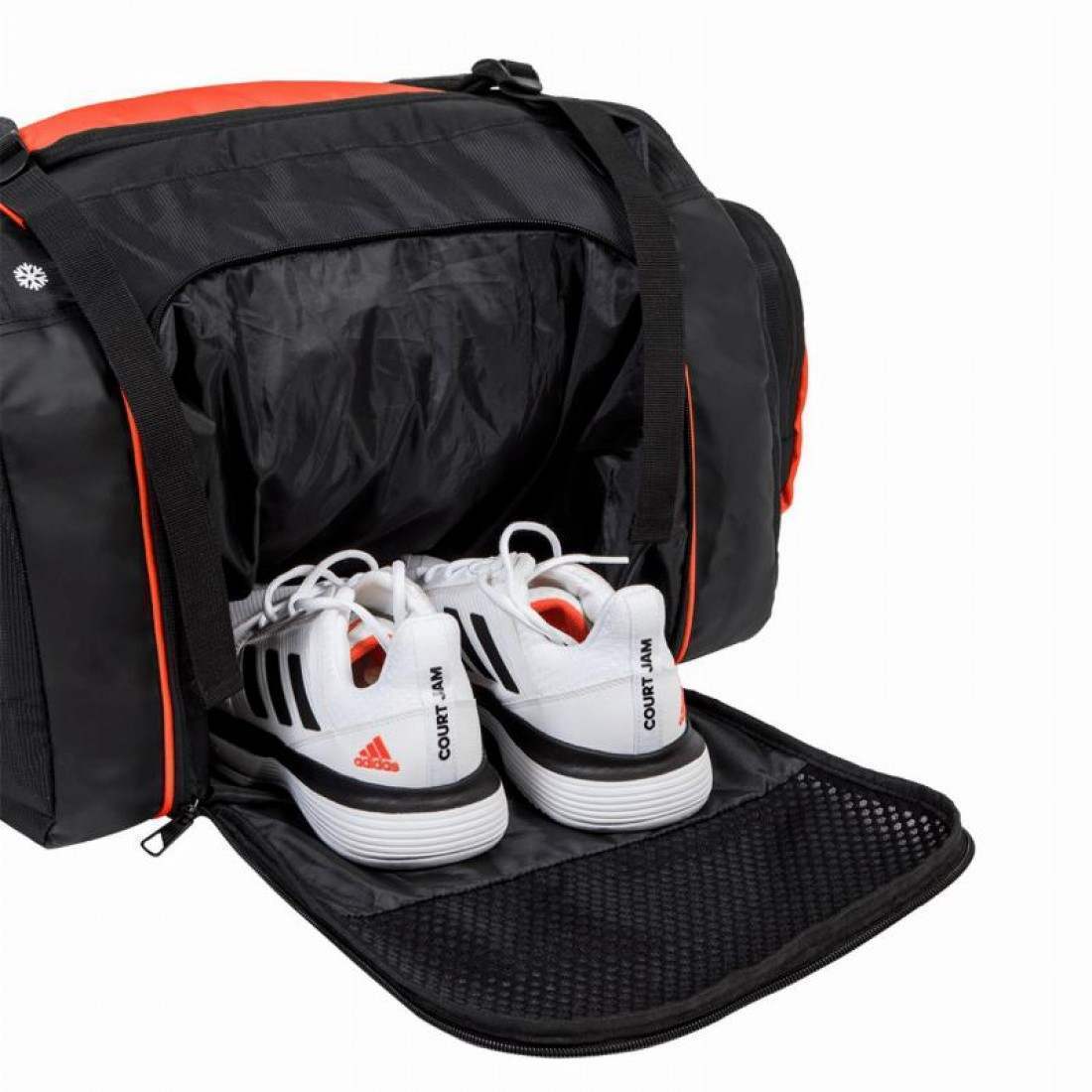 Ademas, incorpora un compartimento amplio para las zapatillas y cuatro pequenos apartados para los objetos que no quieres que se pierdan en el interior.